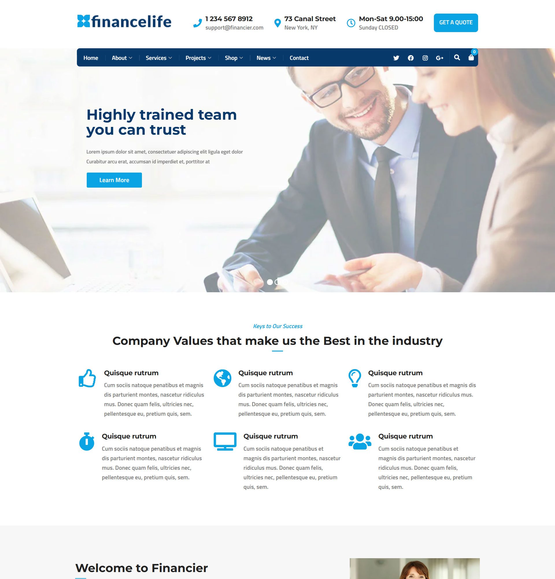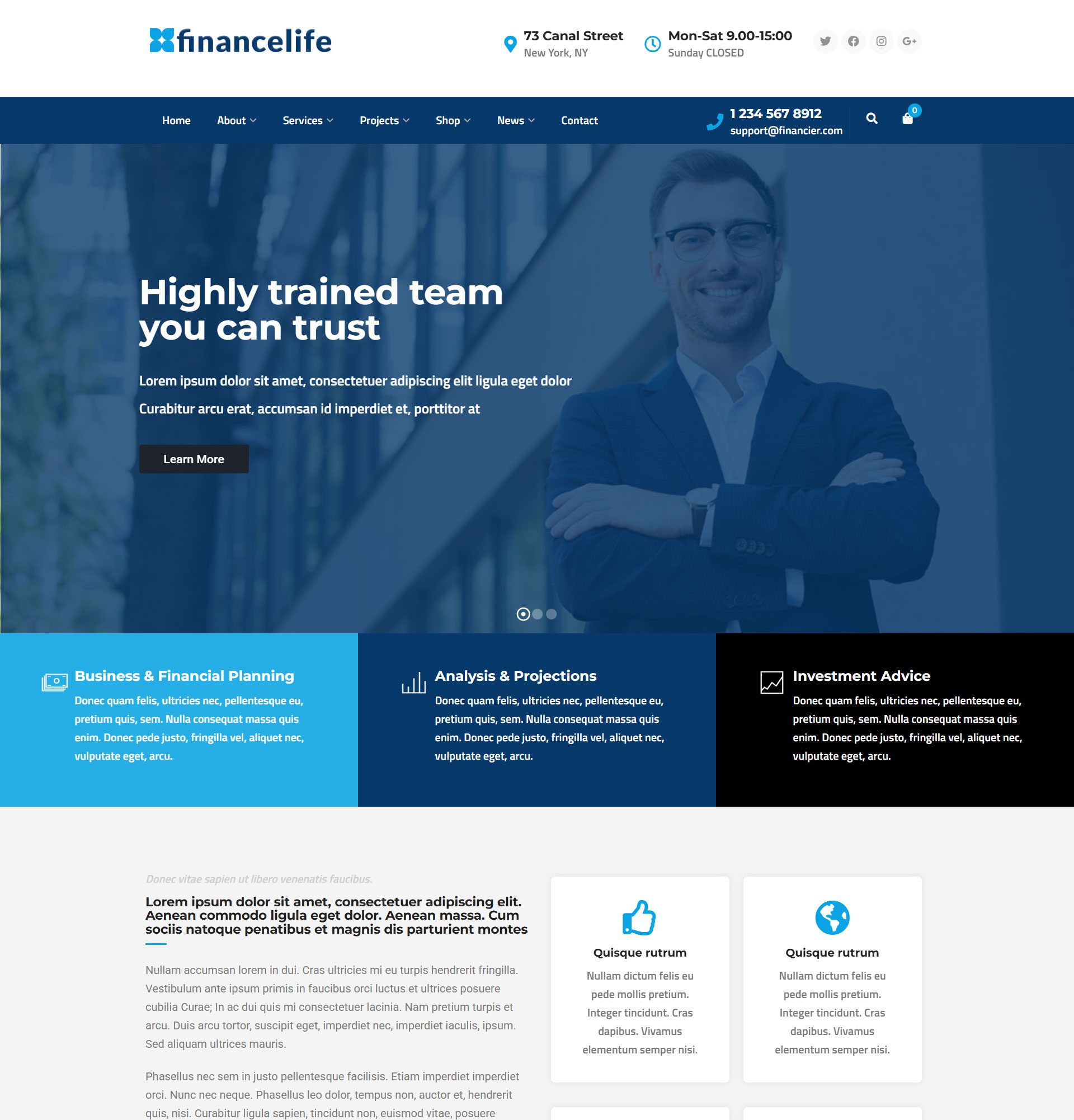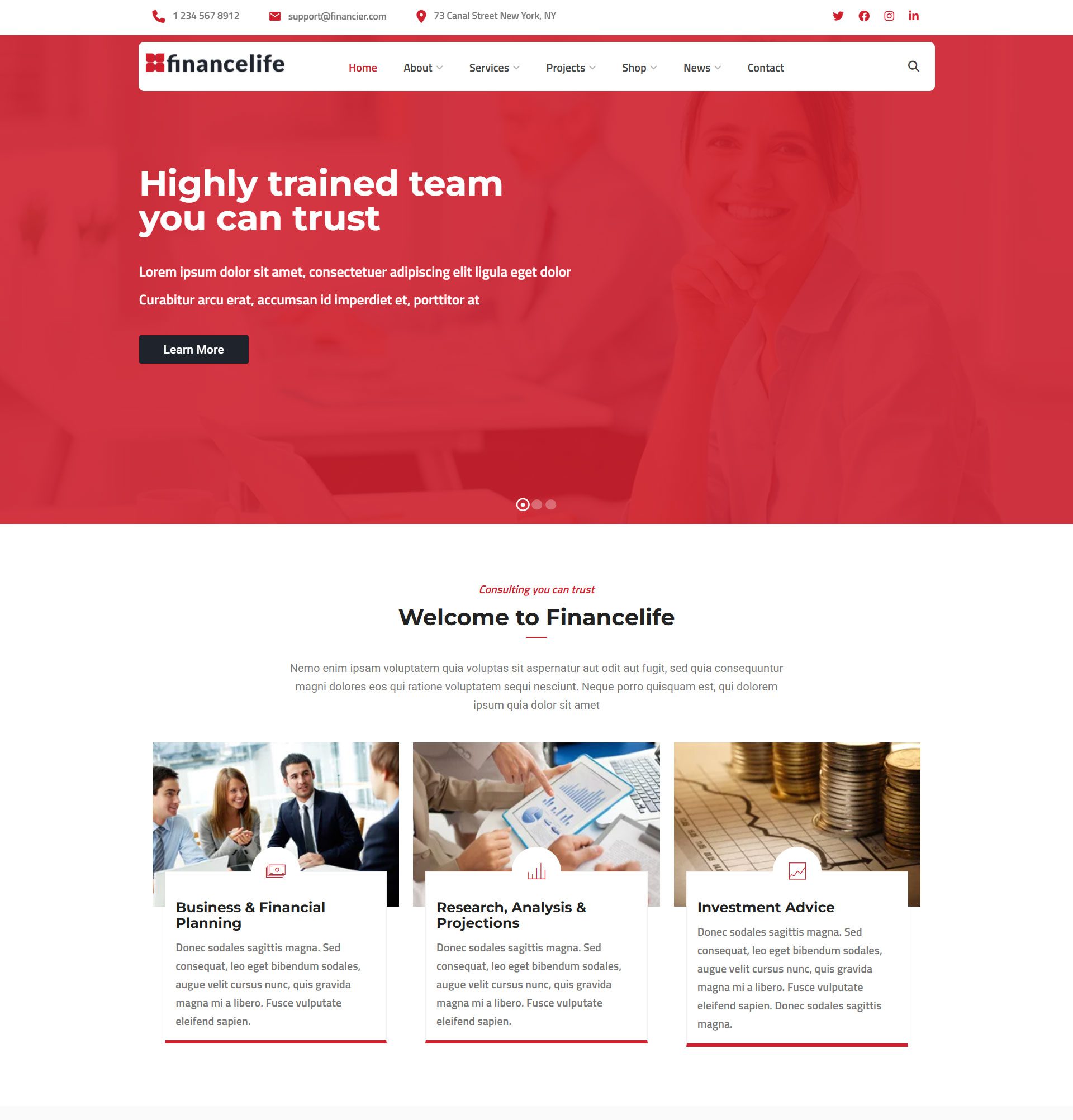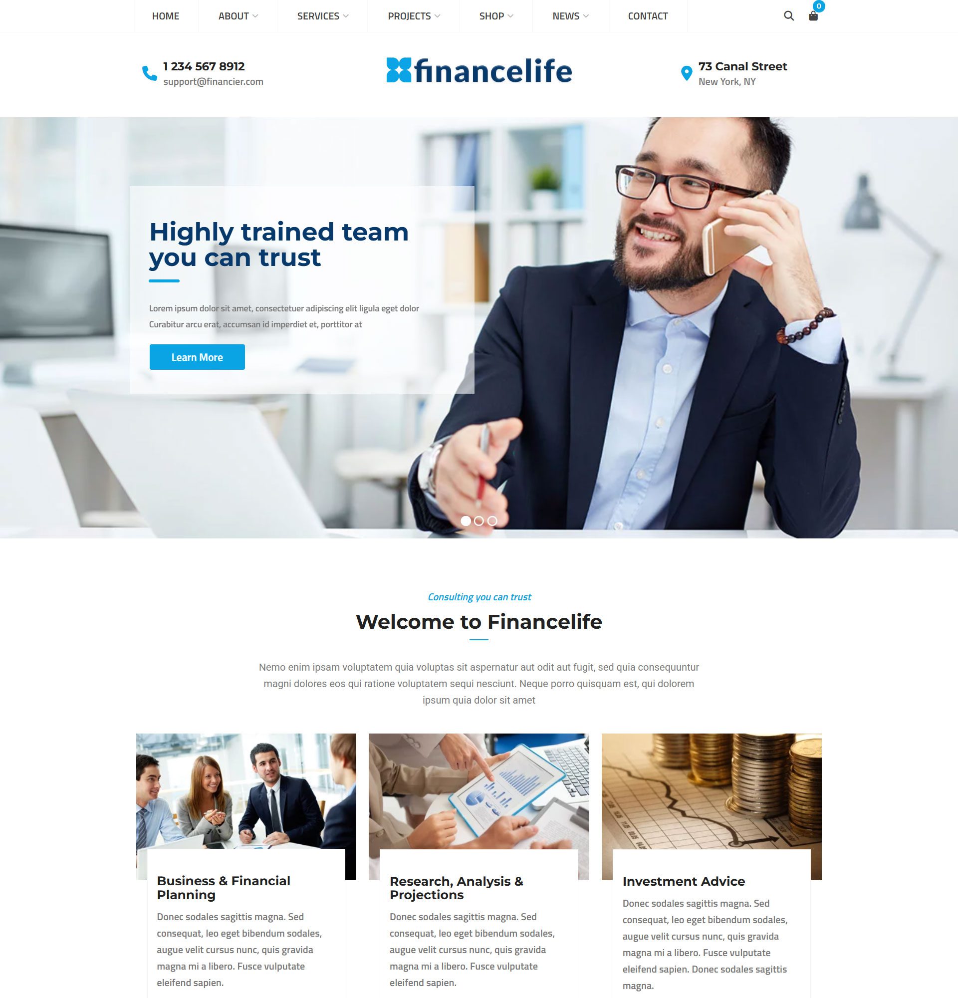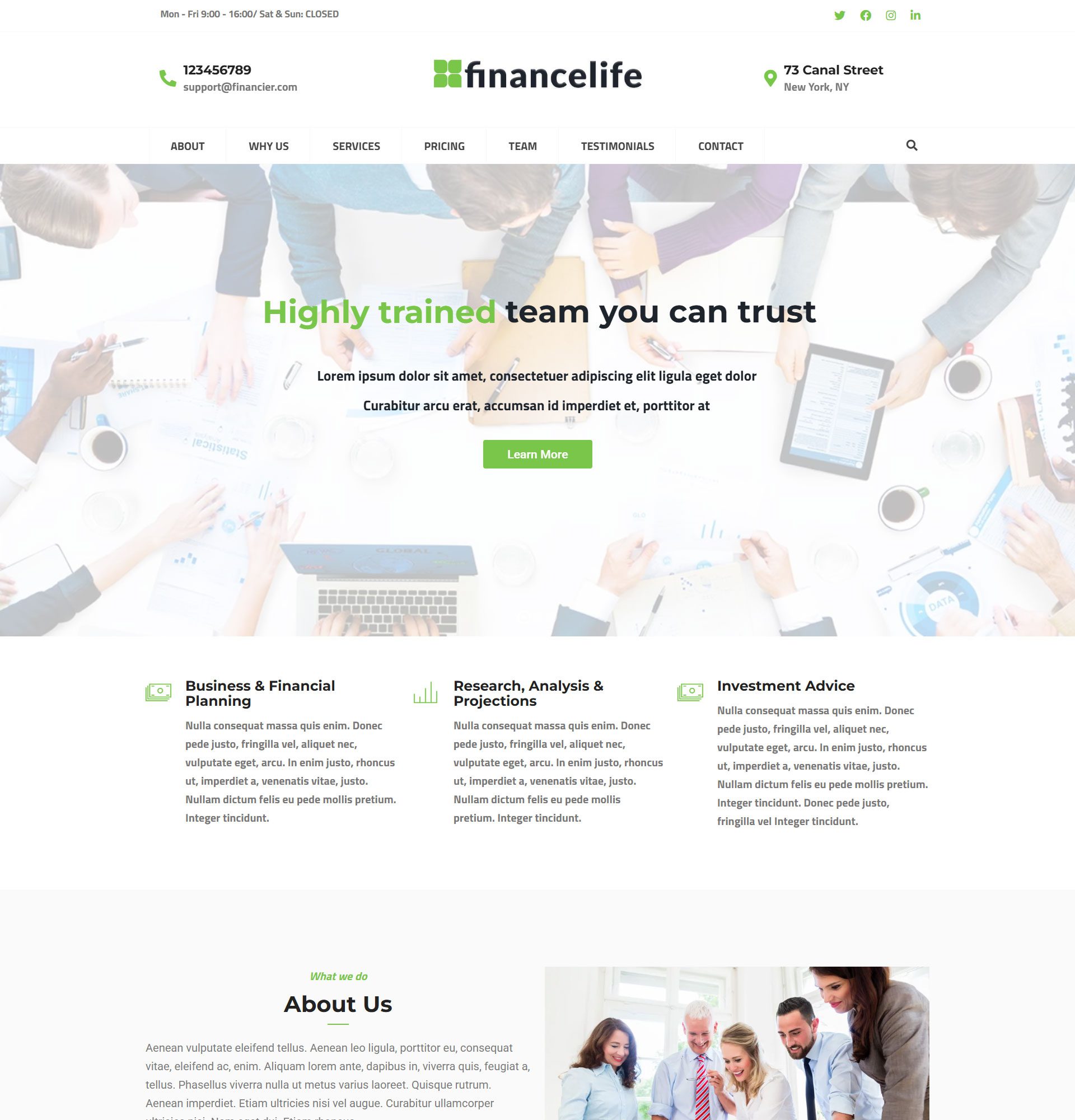 FinanceLife is a clean and modern WordPress theme designed especially for Business Consulting, Insurance Brokers, Financial Advisiors, Law Firms, Accountants, Tax Advisors, Marketing Firms or any other service driven business.